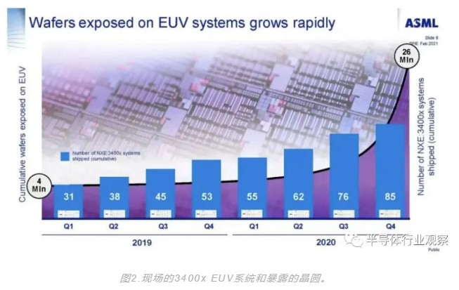 随着三星和台积电在7nm和5nm逻辑生产以及三星在1z DRAM生产中加大对标准0.33数值孔径(NA)系统的使用,EUV曝光的晶圆数量正在迅速增长(见图2)。
