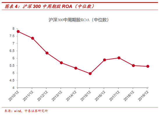 在2011年之后,随着基建和地产投资的高增速下一个台阶,上中游制造业出现产能严重过剩的局面,沪深300中的周期股ROA中位数迅速下降,进入了长期的去产能过程。在2016和2017年供给侧改革和强有力的去产能政策后,周期股的ROA结束了一路向下的趋势,但仍处在较低水平。