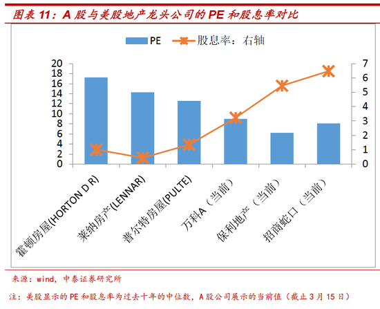 取三家美国房地产龙头公司过去十年的PE和股息率的中位数,与A股三家地产龙头公司的最新(截止3月15日)PE和过去12个月的股息率对比,可以看到三家A股地产龙头公司的PE明显更低,股息率则明显更高。