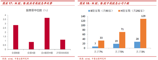 与此同时,H股和B股中金融和周期股较多,股息率优势明显。H股及B股的股息率中位数远高于A股市场平均水平以及沪深300指数。93家B股公司中,54家公司股息率超过3%,其中7家股息率超7%;292家H股公司中,233家公司股息率超过3%,其中33家股息率超7%。