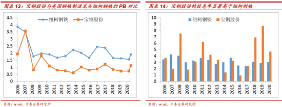 钢铁行业选取了美国最大的钢铁制造公司纽柯钢铁,其生产的钢铁产品线较全,与国内的钢铁龙头具有较高的可比性。但值得说明的是纽柯钢铁主要采用电炉炼钢(主要原材料是废钢),而宝钢主要是高炉炼钢(主要原材料是铁矿石),工艺流程方面还是存在一些差异。从PB和股息率对比来看,宝钢股份估值明显低于纽柯钢铁,而股息率更高。