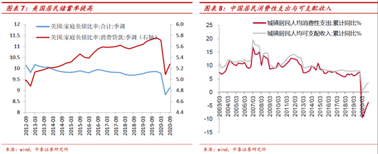 2020年中国的居民可支配收入增速也下降了,但仍为正(3.5%左右),同时消费性支出增速为-4%左右。支出的降幅明显大于收入增速的下降,这意味着后续消费反弹的力度可能超预期。