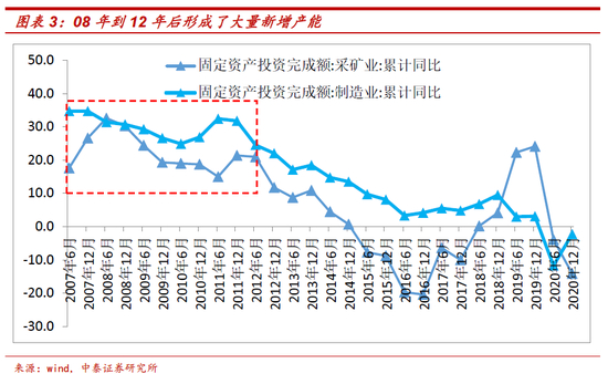 周期股过去长期处于盈利下行周期,估值也无法提升,主要是过去长时间的产能过剩造成的。事实上,2008年金融危机后出台的刺激政策导致的大规模投资正是后续多年产能过剩的主要原因——2009年出台的刺激政策之后,基建和房地产投资的高增速持续到大约2011年底,但制造业的固定资产投资高增速(20%以上)持续到2012年底,随后形成了大量的新增产能,步入漫长的去产能之路。