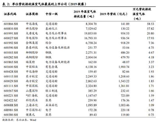 东北证券统计单位营收排放温室气体最高的上市公司,梳理如下:可以看到化工、电力及公用事业、钢铁、轻工、交运行业的 排名最靠前,结合个股情况来看,碳排放强度最高的公司主要来自火电、黑色产业 链、化工、交运等行业,这些行业或将成为未来碳中和实现过程中的关键部门。