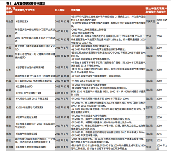从中央到地方层面,目标政策逐渐落地。(1)首次明确碳中和时间点:我国在第75届联合国大会上正式宣布力争2030年前碳达峰,2060年前实现碳中和,随后习主席在气候雄心峰会上再次强调,至2030年中国单位GDP二氧化碳排放将比2005年下降65%以上,非化石能源占一次能源消费比重将达到25%左右。(2)“十四五”规划:到2035年广泛形成绿色生产生活方式,碳排放达峰后稳中有降,生态环境根本好转,美丽中国建设目标基本实现。(3)2020年中央经济工作会议:将“做好碳达峰、碳中和工作”作为2021年八项重点任务之一。(4)多地方积极响应:上海、江苏、广东等多省市出台碳达峰有关规划,其中上海表示力争比全国时间表提前五年实现碳达峰。政策频繁发声落地,体现我国实现碳中和目标的决心。