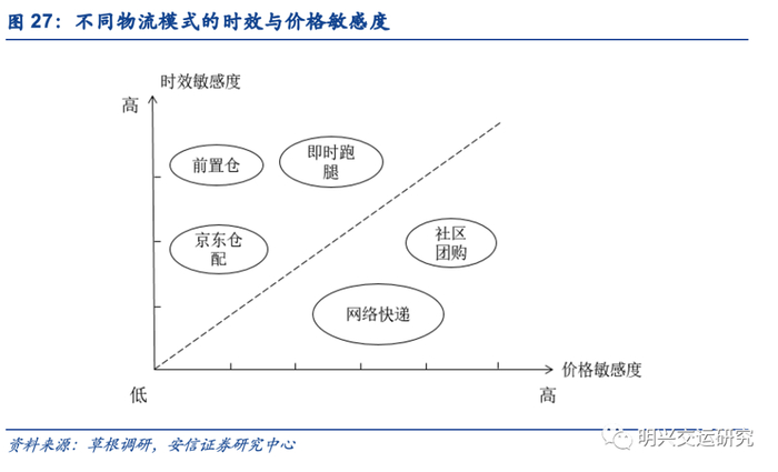 总的来看,不同物流模式的时效与价格敏感度存在较大差异:(1)仓配模式主通常客单价较高,价格敏感度低,周转快,具有较高的时效要求;(2)网络快递适时效要求较低、对价格敏感度高;(3)前置仓定位高消费客群,价格敏感度低,时效要求高。(4)即时配送主要覆盖餐饮外卖、生鲜果蔬、日用百货类商品,具有一定时效要求,价格敏感度一般。(5)社区团购聚焦在高频、刚需的家庭生鲜食品领域,客单价低而时效要求高。