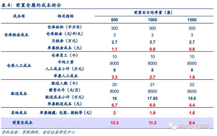 前置仓模式被大量应用于本地生鲜电商、线上商超等零售业态。根据我们的测算,前置仓履约成本主要包括仓库租金成本+人工成本+配送成本+其他成本,日均单量1000单的前置仓单票履约成本约11元。