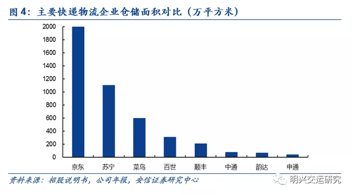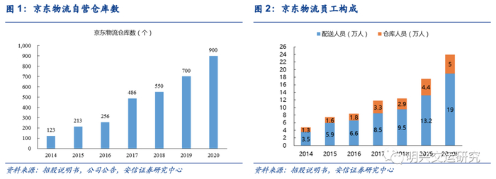 京东物流数十年重资产投入,仓配网络规模和密度领先同行。从2007年开始,京东持续对物流进行自建投入,截至2020年9月30日,公司的仓储网络几乎覆盖全国所有区县,总仓库数达2200个(自营仓库数800 +、云仓数1400+),总面积约2000万平方米,规模和密度领先同行。我们测算京东物流单仓面积约9000平,同时公司拥有超过19万名配送人员以及约5万名仓库工作人员。