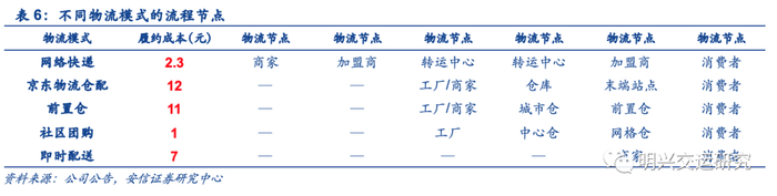 (1)物流环节重构、履约成本大相径庭物流环节的减少可带来履约成本的降低。网络快递模式与仓配模式在物流环节上存在较大差异,网络快递模式一般包括6个物流节点,5道物流程序(揽-转-分拣-转-派),而前置仓模式则包括4个物流节点、3道物流程序(整车入库-出库-派送),至于前置仓、社区团购等均可看成从传统的仓配模式中迭代创新而来,进一步减少物流环节,例如前置仓省略了末端站点,社区团购省略了末端配送,物流模式越直接,中间环节越少,则履约成本更优。