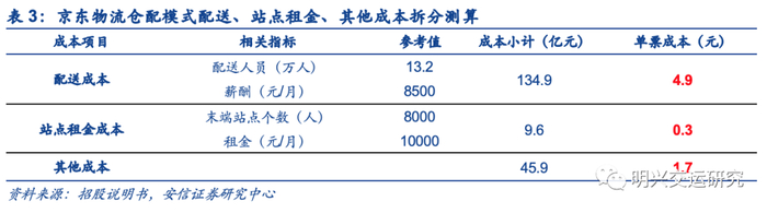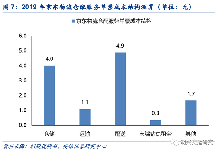 结论:我们测算京东仓配单票成本约12元,大幅低于平均综合成本。其中京东物流单票仓储成本4.0元,单票运输成本1.1元,单票配送成本4.9元,单票末端站点租金0.3元,单票其他成本1.7元(包装耗材等)。