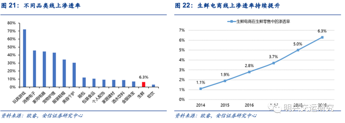 (3)社区团购极致的履约费用具备优势,或在生鲜零售线上化的过程中抢占先机。根据Euromonitor数据,在中国生鲜购买渠道的市场份额中,菜市场和超市仍然是目前消费者购买生鲜产品的主流渠道,但线上市场份额从2014年的1.1%快速增至2019年的6.3%,而在线上渗透率持续提升的过程中,社区团购凭借极致的性价比有望快速提升份额。