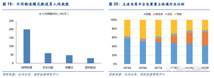 网络快递的环节比仓配多,但履约成本却大幅低于仓配模式,我们认为主要与规模效应有关。网络快递履约成本仅2.5元,主要得益于规模效应:(1)全网快递主要面向淘宝、拼多多等电商平台,而淘宝+拼多多占全行业单量的70%,业务量基数较大;(2)行业龙头集中度高,全网快递龙头日均单量超5000万单,在运输和分拣等环节中的规模效应突出,同时末端快递员人均派单量超200件/日,而仓配模式的人均派件量仅为30-60件/日。