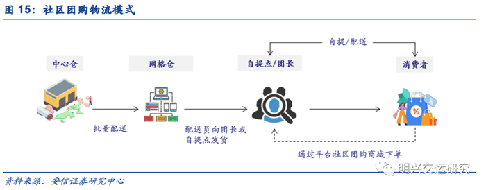 社区团购重构人、货、场的价值,重构物流供应链。社区团购的物流模式包括三个重要节点:(1)中心仓,用于收货、存储、加工和出货;(2)网格仓,类似中转站,负责收货、到团分拣和出货;(3)团长,负责管理订单和消费者自提。这种物流模式相对于平台商城,个人消费者能够自提商品或者由团长送货,降低了履约成本,提升品效。