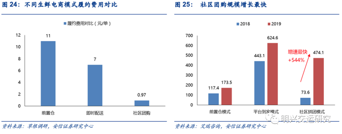 社区团购履约费用最具性价比,助推社区团购快速增长。目前的生鲜电商市场中,同时包括了前置仓(每日优鲜、叮咚买菜)、即时配送(饿了么、美团买菜)、社区团购(兴盛优选、十荟团)多种零售业态,我们在生鲜电商这一维度对比,社区团购的履约费用最低,并助推商流的快速增长。