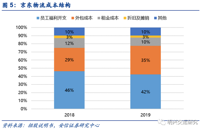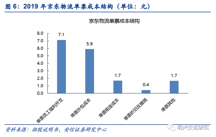 京东物流综合单票成本拆分来看:(1)单票员工薪酬7.1元,包括仓库管理、运输、配送等环节的人工成本;(2)单票外包成本5.9元,公司未进行解释披露,我们预计主要集中在仓库管理、运输等环节的外包;(3)单票租金成本1.7元,包括仓库及配送站点的租金;(4)单票折旧及摊销0.4元;(5)单票其他成本1.7元。