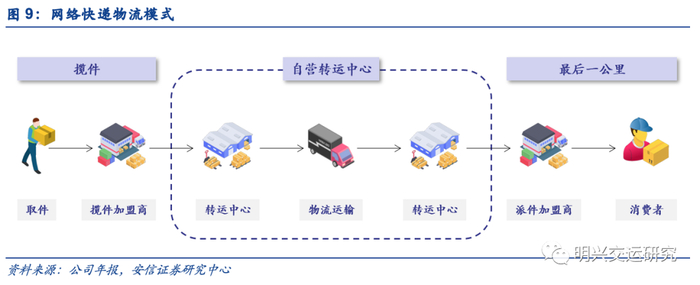 以通达系为代表的加盟制快递企业,建立了完善的网络快递模式,将电商包裹通过揽件-中转-干线运输-中转-末端配送的物流方式进行运转。以行业龙头中通为例,根据其年报披露,在全国范围内拥有91个中转中心、3万家终端网点,覆盖全国99%的县级城市。