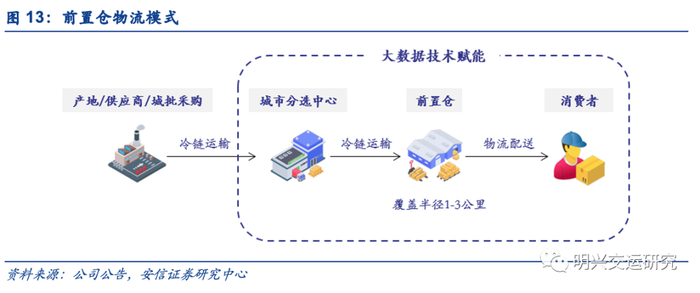 前置仓是一种更靠近消费者的仓配模式,将货品按供应商-城市分选中心-前置仓-末端配送的流程进行供应,与传统仓配相比减少了末端配送站点。前置仓立足于用户角度,实现更快的配送速度,消费者下单后,商品从附近的前置仓发货,由配送员上门送货。前置仓一般设置在社区附近或较大的店面内,覆盖半径1-3公里,履约时效约30分钟。