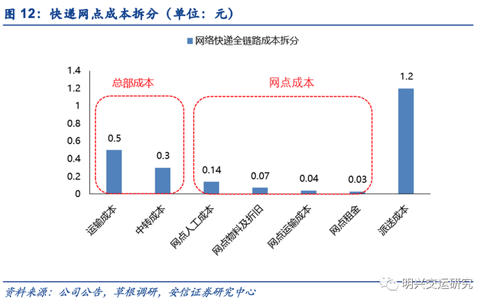 快递网点成本约0.28元,成本占比最低。我们以义乌市某品牌快递网点为例进行成本拆分测算(日均进出港快递5万票),测算单票网点人工成本约0.14元(主要包括客服和分拣操作工成本),网点物料及折旧成本0.07元,网点运输成本0.04元(主要包括往返转运场的运输成本),网点租金0.03元。
