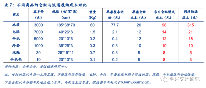 (1)网络快递VS仓配我们认为仓配模式主要适用于标品,通常客单价较高,周转快,具有一定的时效要求,SKU较少,例如家电、3C电子产品、快消品等;网络快递适用于非标品,时效要求相对不高、对履约成本敏感度高,SKU较多,例如服装、食品、日用品等。