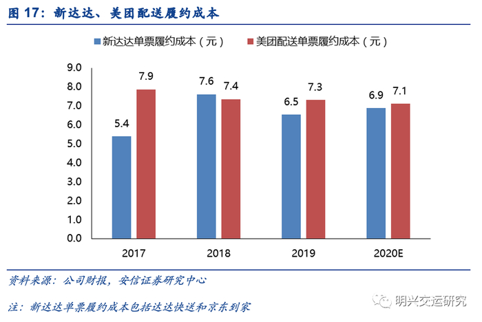 总的来看,随着规模效应增加和效率改进,京东物流的降本空间较大。我们测算2019年京东物流单票仓配成本同比下降3.7%,主要受益于仓储和运输环节的规模效应(单票仓储成本-11%,运输成本-27%),随着业务量增长和京东在仓储、运输效率上的提升,降本具有持续性;而2019年单票配送成本上涨12%,主要由于2019年配送人数的大规模增长,从2018年的9.5万人增加至13.2万人,或由于京东对外开放物流后单量增长所致,随着末端人员稳定和效率提升,相较传统快递末端,京东物流的配送成本具备较大优化空间。