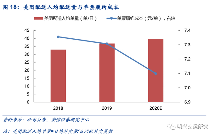 以美团配送为例,人均配送单量的提升进一步降低单票履约成本。我们根据美团配送日活跃骑手数量测算2020年人均配送单量约40单/日(较2019年提升3单/日),单票履约成本约7.1元(较2019年下降0.2元/单),随着人均效能的连续提升,单票履约成本随之下降。