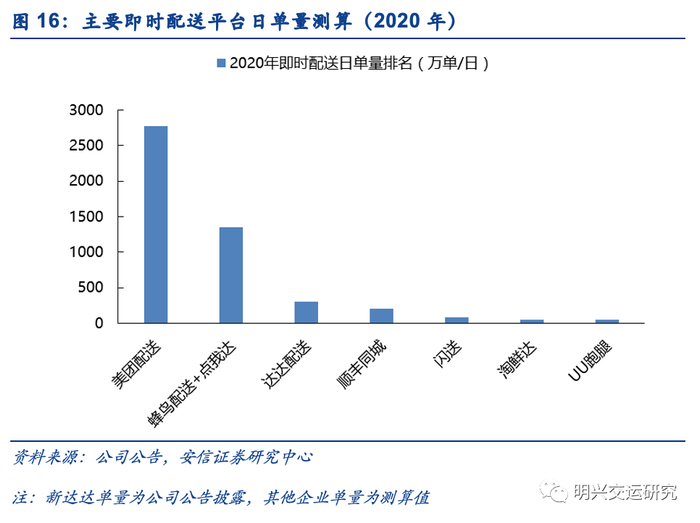 即时配送模式简易,主要依靠骑手将商品从本地商家配送至消费者。即时配送有两种主要模式:1)自营模式:以自营的形式招募骑手,优势体现为管控力度强,服务品质、服务时效均有保障;2)众包模式:利用社会闲散运力,主要优势为运力招募迅速,平台化模式轻,实现物流配送劳动力的增加以及配送效率的提升。 美团、蜂鸟、达达占据即时配送前三席。根据各配送平台披露单量,我们测算2020年即时物流行业中的美团配送、蜂鸟配送(含点我达,负责饿了么众包配送)和新达达占据前三席:美团配送日均单量约2770万单(2020Q1-Q3日均2500万单);蜂鸟+点我达日均单量约1350万单;新达达日均300万单,行业呈现寡头竞争格局。