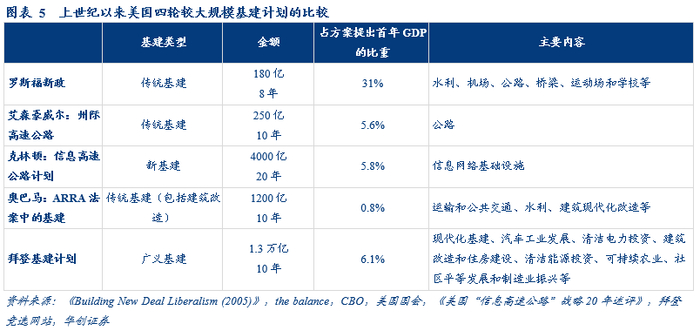 上世纪以来,美国经历过四次联邦政府主导的大规模基建投资,从历史比较看,拜登基建计划是上世纪以来美国第二大规模的联邦基建投资。上世纪以来美国联邦政府主导了四轮大规模基建投资,投资力度最大的是罗斯福新政,公共工程相关支出180亿美元,占1933年GDP的31%;投资力度最小的是奥巴马ARRA法案,其中基建类支出1200亿美元,占2009年GDP的0.8%。艾森豪威尔修建州际高速公路的耗资为250亿美元,约占1956年GDP的5.6%,克林顿的信息高速公路计划总投资额4000亿,占1993年GDP的5.8%。拜登竞选网站上公布的基建类支出大约为1.3万亿美元,约占2019年GDP的6.1%,是上世纪以来规模第二大的投资。