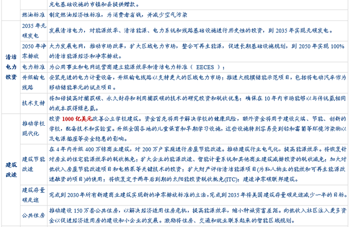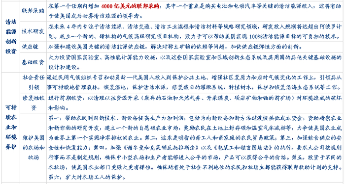 1)内容十分广泛。涵盖了现代化基建、汽车工业发展、清洁电力投资、建筑改造和住房建设、清洁能源投资、可持续农业、社区平等发展和制造业振兴共八大领域。