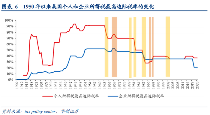 在1950年以前,美国个人所得税和企业所得税最高边际税率均呈逐渐上升趋势,这一时期,加税的主要原因是为战争筹资,在一战和二战期间,个人所得税和企业所得税最高边际税率大幅上升。