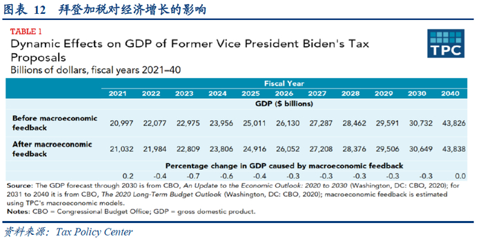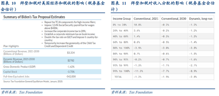 就经济增长而言,税务基金会和税收政策中心均预估加税会对未来十年对经济增长造成负面影响,会使未来十年GDP下降1.62%~3.4%。