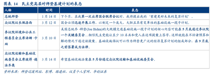 另据高盛预计,白宫或在5月向国会递交详细的预算方案。再根据民主党高层的表态,希望基建方案能在5月通过参众两院下属的委员会,因此我们预计,重建计划的总规模和具体的项目细节大概率将于4-5月公布。
