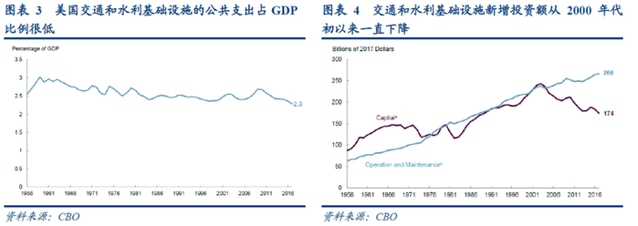 3、美国基建支出力度远低于世界主要经济体,并且主要依赖于州和地方政府。欧洲国家在建设和维护基础设施上的支出相当于GDP的5%,中国的基础设施支出平均约占其GDP的8%,而美国仅为2.4%。此外,与多数其他工业化国家的不同之处在于,美国主要依赖地方和州政府的支出来满足其基础设施的需求。大多数欧洲国家或地区在国家层面上为大部分基础设施建设提供资金,但2017年美国公共基础设施资金中只有25%来自联邦政府,这个数字远低于1977年38%的峰值,表明联邦政府在公共基建上承担的支出责任越来越少。随着美国基建存量不断增加,州和地方政府不得不承担更多的运营和维护成本,也使得基建的新增投资额从2000年代初以来一直下降。