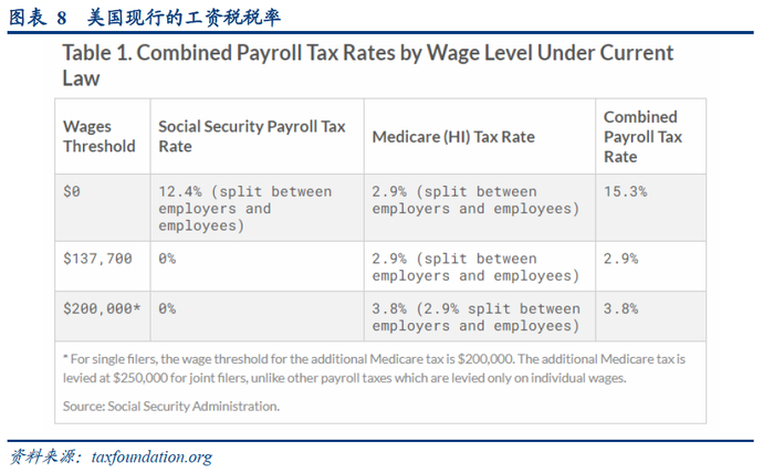 1)对年收入超过40万美元的人征收12.4%的社会保障工资税(Social Security payroll tax),由雇主和雇员平分。在先行的税法下,年收入高于13.77万的个人不需要支付社会保障工资税。