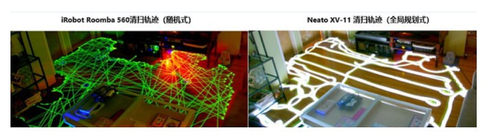 以往的扫地机器人采取的是随机式清扫模式,既然是随机,那效率和结果当然也是随机的,正如上面左图,存在着多处折返,还有盲区,效率比较低,而加装了激光雷达采取了全局规划式清扫模式后,不但不存在盲区,由于知道自己的位置,不会重复清扫,效率也大大提升,所用的时间大约只有随机式清扫的四分之一左右。