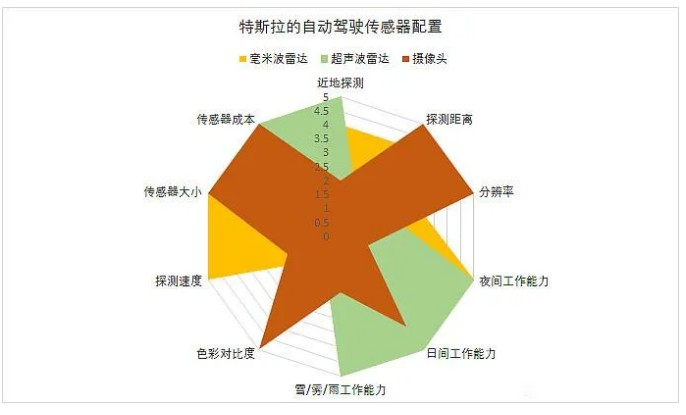 特斯拉采用了视觉为主,超声波雷达为辅的解决方案。一辆Model 3上,共有8个摄像头,1个毫米波雷达,12个超声波雷达,在这个组合下,从理论上说,如上图,也能做到十个特征全部满分。