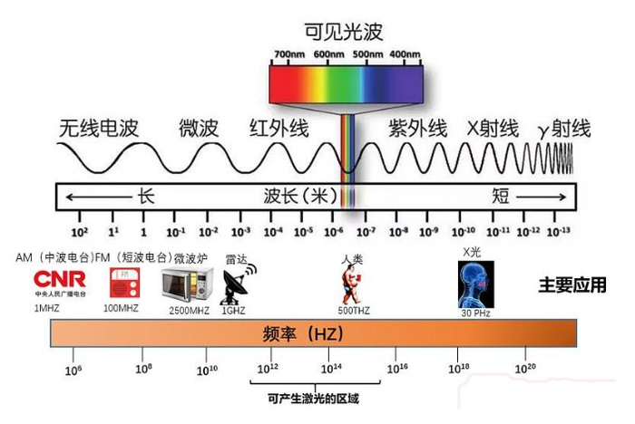并不是所有的电磁波都可以产生激光。沿着电磁波的频率图往右走,与雷达波相邻的红外线、可见光和紫外线,都可以发出激光。既然我们用厘米波制作雷达,那么顺理成章的激光也可以做雷达,这就是激光雷达的理论依据。