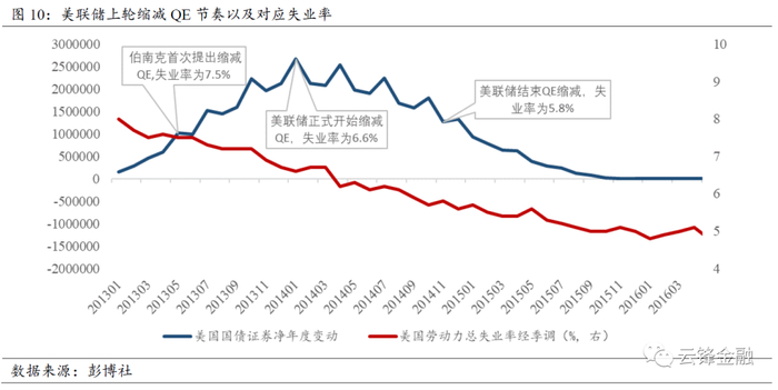 在就业与taper的关系上,我们需要注意就业完全复苏并非缩减QE的必要条件,取得足够进展才是关键。在4月的议息会议的概述中,一些参会者表示“经济取得逐步进展”即可开始讨论缩减QE,在前一轮的缩减QE的过程中也验证了这一点。2013年5月,伯南克首次提出缩减QE时,美国的失业率为7.5%,远未达到就业目标,但美联储认为经济恢复已经具有持续性,就业将逐步修复,事实情况也是如此,2013年12月,美联储开始缩减QE,失业率下降到6.6%,到2014年10月结束缩减QE时,失业率已经下降到了5.8%,缩减QE完成后,美国失业率也保持下跌的趋势,持续到了2018年9月。由此可见,就业市场的持续复苏才是美联储缩减QE的关键,而非以疫情前就业水平作为参考。