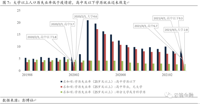 低学历人口上,2021年4月的高中、高中以下学历人群的失业率分别为6.7%、9.3%,而疫情前的失业率分别为3.7%、5.8%,还有3%、3.5%缺口。目前,大学以上学历的失业率为2.8%,比疫情前下降1.8%,低学历就业修复远不及高学历部分。