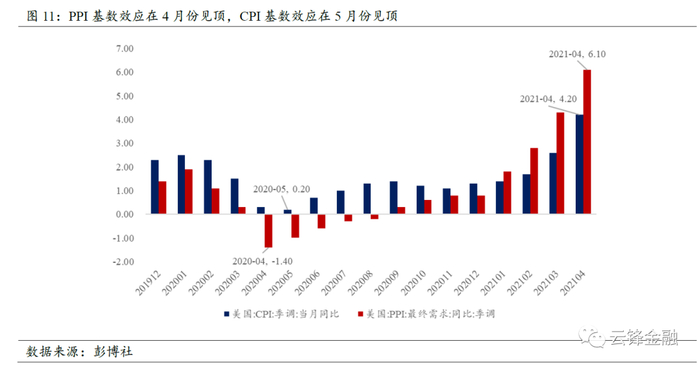 近期,美国通胀数据大幅上涨。4月美国PPI季调环比增长0.6%,季调同比增长6.1%,同比增速创历史新高,CPI季调环比增长0.8%,季调同比增长为4.2%,同比升幅创2008年9月以来最大值。上涨的主要原因有两个,一是基数效应,二是财政对个人的补助。