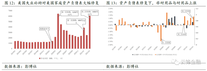 三次的救助使美国居民资产负债表大幅修复,为短期的通胀提供土壤。在三次救助过程中,美国居民储备从疫情前的1.39万亿上涨到了2021年3月的6.04万亿,资产负债表的修复造成了短期内消费品,特别是耐用消费品的需求上涨,美国CPI耐用品消费指数近四个月平均增长1.11%。我们认为,随着补助发放的停止,美国家庭资产负债表将逐步回落,短期需求刺激造成的消费品通胀将趋缓。