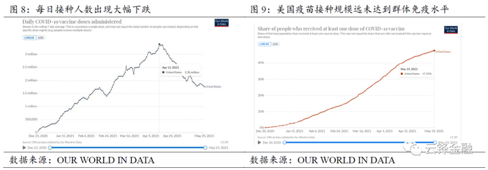 造成就业市场修复速度下降与结构性失业主要原因有两点:一是美国失业救济对工作的替代效应。目前,美国为失业人群发放每周300美元的救济金,这使部分低收入劳动人群工作的带来的边际收益出现下降,从而对劳动力市场造成一定替代作用,使得服务业以及低学历人群就业市场出现较大的供需缺口。二是美国疫苗接种量放缓。美国每日接种疫苗量已经从4月最高的每日338万剂,下降目前的每日175万剂。随着接种覆盖率的增加,未接种的人群中老人、幼儿以及不愿接种的人群数量增加,接种量出现大幅放缓。目前,美国至少接种一针疫苗的人数约为一半左右,距离70%的群体免疫水平还有一段距离,群体免疫时间的推迟使得经济复苏延后。