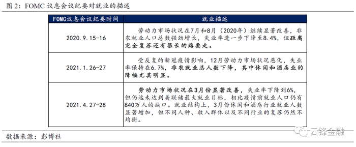 在“重就业”上,美联储着重强调了就业修复的漫长性。2020年9月,美联储对就业的描述为“劳动力市场状况在7月和8月继续显著改善,但距离完全复苏还有很长的路要走”。2021年1月的描述为“非农就业总人数下降,其中休闲和酒店业的降幅尤其明显”。最近一期表述为 “随着疫苗接种取得进展和强有力的政策支持,经济活动和就业指标有所加强。受大流行病不利影响最大的部门仍然薄弱,但已显示出改善”。