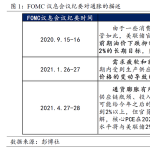 而在“轻通胀”上,美联储着重强调了对通胀的容忍度以及通胀的不可持续性。2020年9月,美联储表示“预计通胀将在相当长一段时间内低于美联储2%的长期目标”。2021年1月的描述为“一些商品的价格可能会上涨,但这种价格的变动导致的通胀是暂时性的,不太可能产生持久的影响”。最近一期的描述为“在短期效应消退后,通胀会有所缓解”。