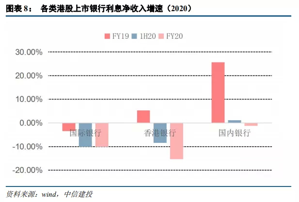 从2020年利息净收入增速来看,各类银行利息净收入同比均为负增长,净息差下滑及贷款增速减慢是主因。其中香港银行降幅最大,利息净收入同比下降15.31%;其次为国际银行,利息净收入同比下降10.11%;而国内银行的降幅最小,利息净收入同比下降1.27%。
