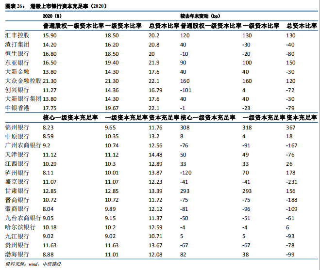 2020年港股上市的內银资本充足率同样表现分化。其中锦州银行、中原银行、江西银行、甘肃银行三大资本充足率均提高,其中锦州银行2020年9元完成120.9亿元定向增发,三大资本充足率大幅提升,分别提高308bps、318bps、367bps。而广州农商行、盛京银行、晋商银行、徽商银行、九台农商行、贵州银行三大资本充足率均在下滑。整体来看,大部分港股上市的内地上市银行的核心一级资本充足率补充压力较大,接近监管红线。