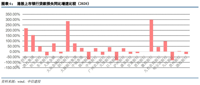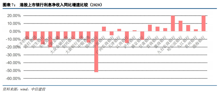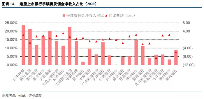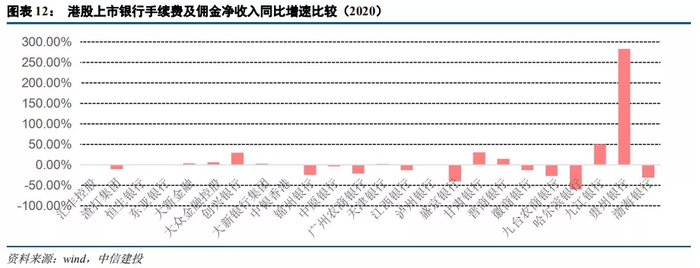 具体来看,24家上市银行中有9家银行的手续费及佣金净收入实现正增长,香港银行有4家及国内银行有5家。其中手续费及佣金净收入同比增幅最大的为贵州银行,同比增长283.07%,主要是低基数影响,2019年贵州银行手续费及佣金净收入占比仅0.88%,2020年上升至3.22%。国内银行中增幅较大的包括甘肃银行、晋商银行、九江银行,增幅均超过10%。香港银行中手续费及佣金净收入增长最快的为创兴银行,同比提升29.04%。