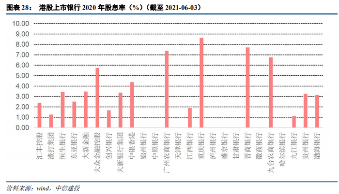 受疫情及全球经济不明朗影响,汇丰控股及渣打集团两家国际银行在2020年内未进行派息,但是今年恢复派息,汇丰控股决定2020年度派息0.15美元/股,渣打集团0.09美元/股,分红比例分别达59.4%及39.4%,同比变动为-24.3个百分点和29.4个百分点,整体分红比例高于国内银行。所有香港银行分红比例均有下降,整体香港银行分红比例为37.2%,较上年下降3.8个百分点。而仅在港股上市的国内银行分红比例表现差异化,部分银行选择年度不派息,包括中原、天津、泸州、徽商及哈尔滨银行,而2019年有派息。其他有派息的国内银行平均分红率为30.0%,与A股上市银行相当。