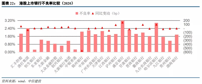 具体来看,国际银行不良率表现分化。其中汇丰控股良率同比提升55bps至1.87%,而渣打集团不良率同比下降38bps至2.41%。所有香港银行的不良率均提升,其中大新金融、创兴银行、大新银行集团的不良率升幅均大于30bps。国内银行的不良率表现差异化,除锦州银行不良率大幅改善以外,江西银行不良率同样降幅较大,同比下降52bps至1.73%,而不良率升幅最快的为盛京银行,不良率同比提升151bps至3.26%,也是不良率最高的内地银行。而徽商银行及哈尔滨银行的不良率抬升也较快,分别提升94bps至1.98%和98bps至2.97%。国内银行中不良率最低的为贵州银行,不良率为1.15%,同比下降4bps。