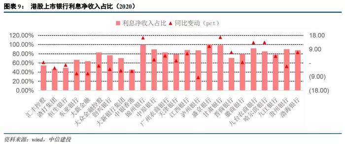只在港股上市的国内银行利息净收入占比明显上升,除泸州银行、贵州银行同比下降外,其他国内银行占比均同比提升。其中锦州银行、盛京银行、甘肃银行的利息净收入接近100%,占比同比上升超过10个百分点。