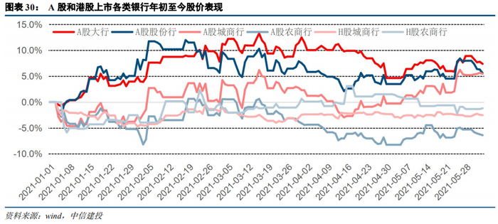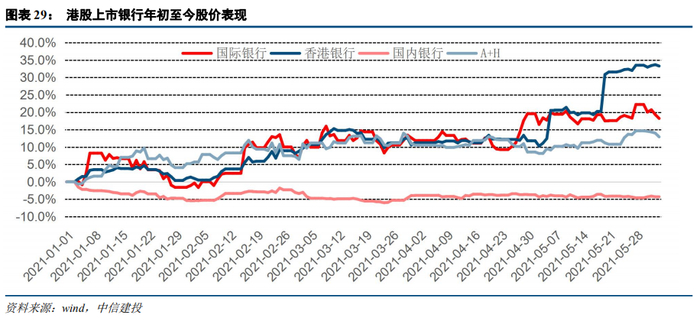 从股价表现来看,停止派息或大幅减息的疑虑消除,国际银行及香港银行的股价今年以来不断修复。截至2021-06-03,国际银行平均股价整体较年初上涨了18.2%,而香港银行上涨了33.3%。香港银行5月大幅上涨主要是受到创兴银行计划私有化的公告影响,创兴银行的股价较年初至今已经上涨119.5%。仅在港股上市的国内银行股价表现疲弱,年初至今股价累计下跌4.4%。而港股A+H的银行股价表现较好,年初至今股价累计上涨12.9%。